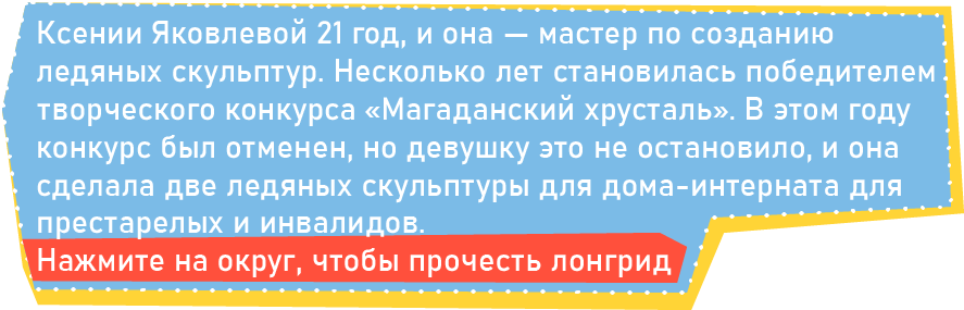 Ксении Яковлевой 21 год, и она — мастер по созданию ледяных скульптур. Несколько лет становилась победителем творческого конкурса «Магаданский хрусталь». В этом году конкурс был отменен, но девушку это не остановило, и она сделала две ледяных скульптуры для дома-интерната для престарелых и инвалидов.